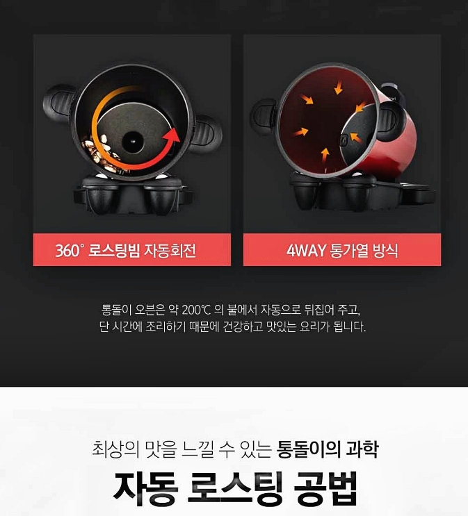 간략한 핵심 특징만 말해드리자면, 통돌이 오븐기는 로스팅빔이 알아서 뒤집어 주는 원리에요