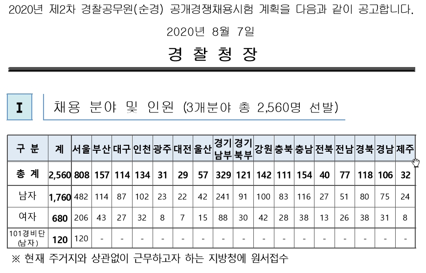 2020년 2차 경찰공무원 채용인원이 나왔습니다.