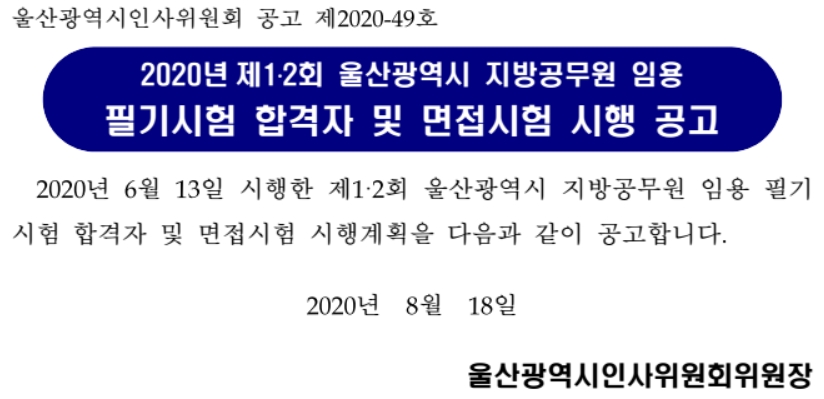 2019 울산 9급 필기시험 합격자 발표, 합격선, 면접장소 & 면접일정 공개했습니다. 울산광역시 9급