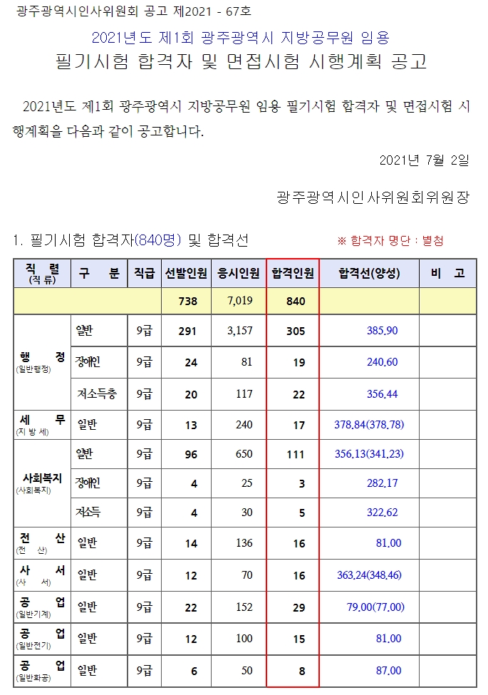 2021년 제1회 광주 지방공무원 필기시험 합격자는