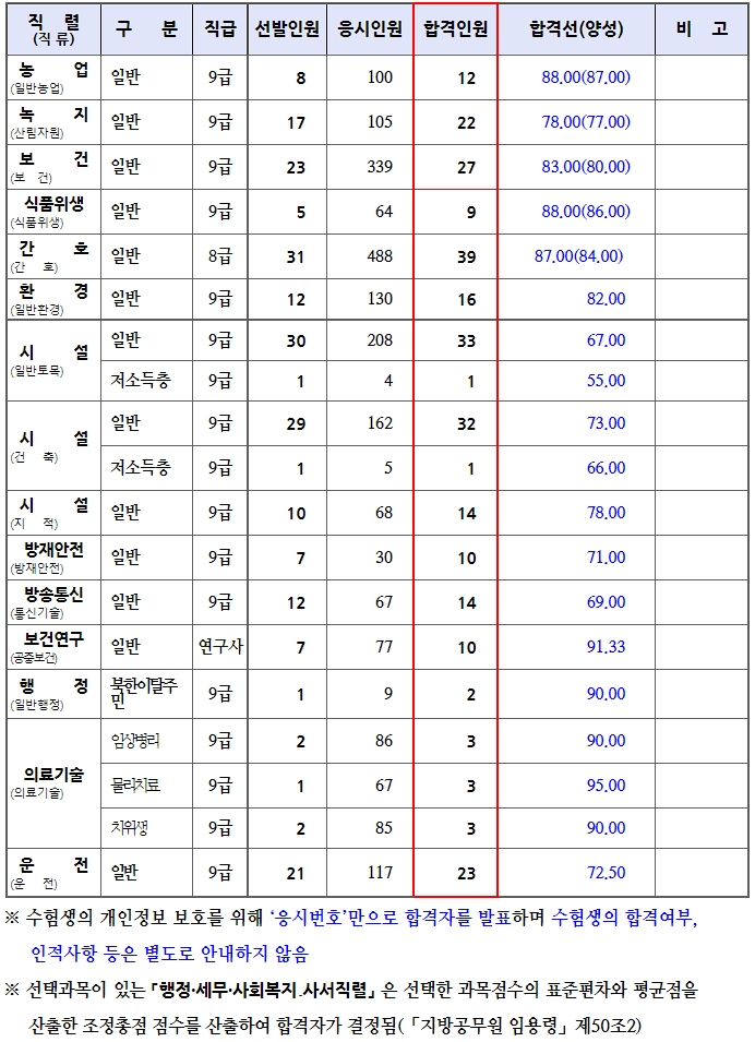 수험생의 개인정보 보호를 위하여 모든 직렬의 합격자 성명은 공개하지 않으며,