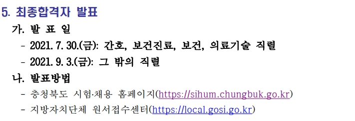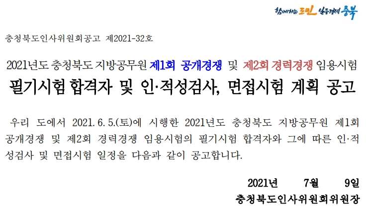 내용 우리 도에서 2021.6.5.(토)에 시행한 2021년도 충청북도 지방공무원 제1회 공개경쟁 및 제2회 경력경쟁 임용시험의 필기시험 합격자와 그에 따른 인·적성검사 및 면접시험 일정을 다음과 같이