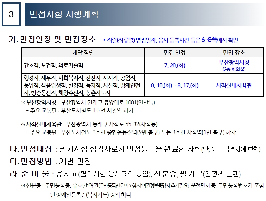 1) 면접시험 대상자는 직렬(류)별 해당 면접일에 지정된 등록시간까지 면접시험 장소에서 응시등록을 하여야 하며,