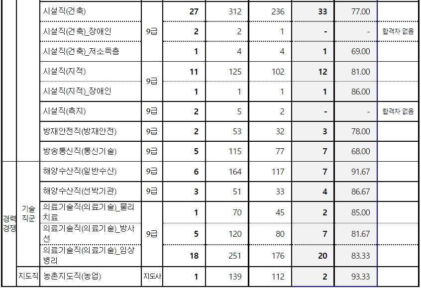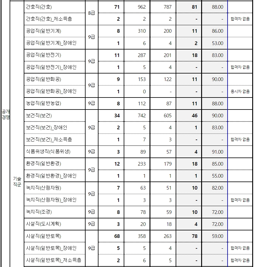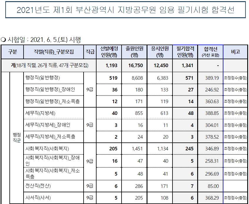 2021년 부산광역시 지방직공무원 공개채용 합격선과