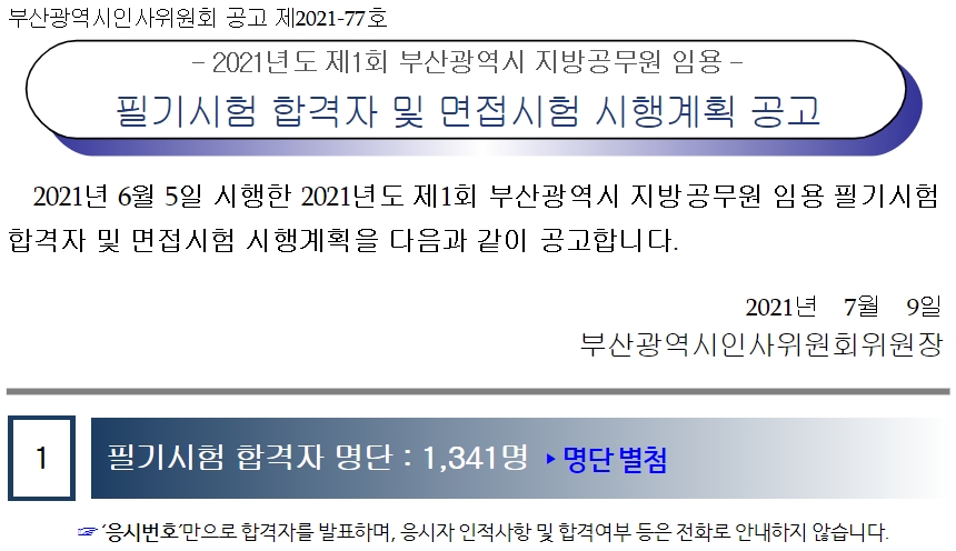 2021년 제1회 부산 지방공무원 필기시험 합격자는